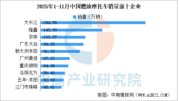 1-11月,燃油摩托車銷量前十名企業(yè)(集團(tuán))為大長江、隆鑫、宗申、廣東大冶、新大洲本田、廣州豪進(jìn)、重慶銀翔、洛陽北方、五羊-本田、江門市珠峰,分別銷售244.56萬輛、143.99萬輛、103.87萬輛、99.65萬輛、91.02萬輛、67.22萬輛、64.49萬輛、56.49萬輛、52.98萬輛和48.41萬輛。