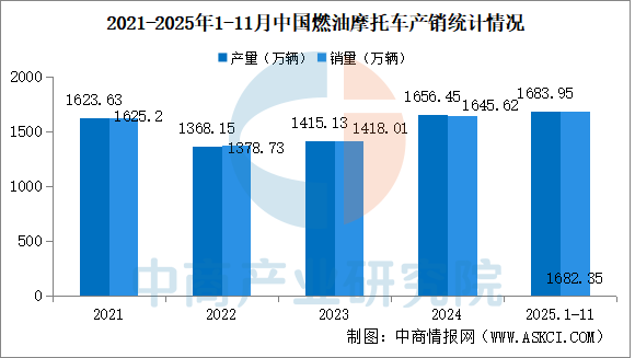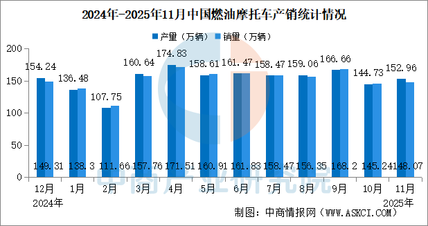中商情報網(wǎng)訊:11月,全行業(yè)完成燃油摩托車產(chǎn)銷152.96萬輛和148.07萬輛,環(huán)比增長5.68%和1.95%,同比增長9.61%和7.43%;1-11月,全行業(yè)完成燃油摩托車產(chǎn)銷1683.95萬輛和1682.35萬輛,同比增長9.61%和7.43%。