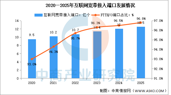 2025年,新建光纜線路長度211.3萬公里,全國光纜線路總長度達(dá)7499萬公里;其中,長途光纜線路、本地網(wǎng)中繼光纜線路和接入網(wǎng)光纜線路長度分別達(dá)114.3萬、3006萬和4379萬公里。截至2025年底,固定互聯(lián)網(wǎng)寬帶接入端口數(shù)達(dá)到12.51億個(gè),比上年末凈增4877萬個(gè)。其中,光纖接入(FTTH/O)端口達(dá)到12.1億個(gè),比上年末凈增5030萬個(gè),占比由上年末的96.5%提升至96.8%。截至2025年底,具備千兆網(wǎng)絡(luò)服務(wù)能力的10G PON端口數(shù)達(dá)3162萬個(gè),比上年末凈增341.9萬個(gè)。