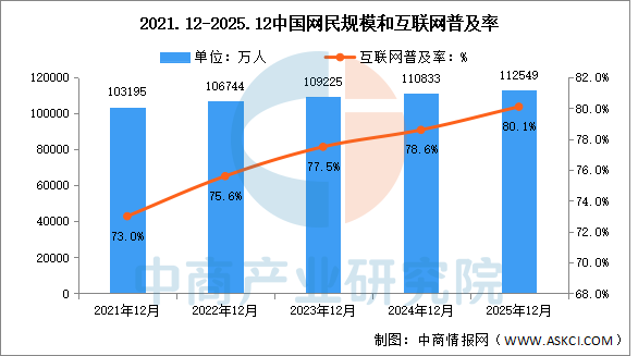 中商情報(bào)網(wǎng)訊:截至2025年12月,我國(guó)網(wǎng)民規(guī)模達(dá)11.25億人,較2024年12月增長(zhǎng)1717萬(wàn)人,互聯(lián)網(wǎng)普及率達(dá)80.1%,較2024年12月提升1.5個(gè)百分點(diǎn)。