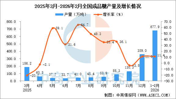 中商情報(bào)網(wǎng)訊:據(jù)中商產(chǎn)業(yè)研究院數(shù)據(jù)庫(kù),2026年1-2月全國(guó)成品糖當(dāng)月產(chǎn)量與去年同期相比增長(zhǎng)。2026年1-2月全國(guó)成品糖產(chǎn)量為677.9萬(wàn)噸,同比增長(zhǎng)11.4%。
