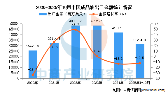 2025年10月中國(guó)成品油出口量及金額增長(zhǎng)情況