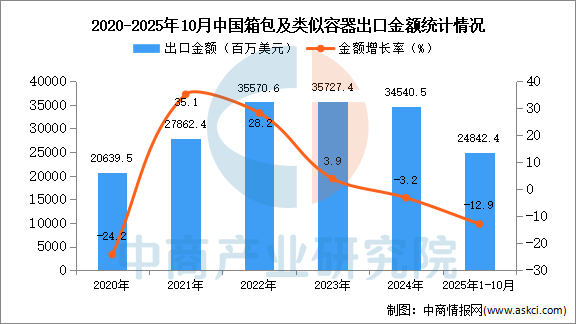 2025年10月中國箱包及類似容器出口量及金額增長情況