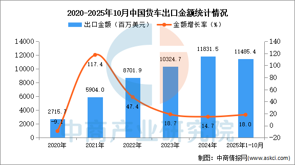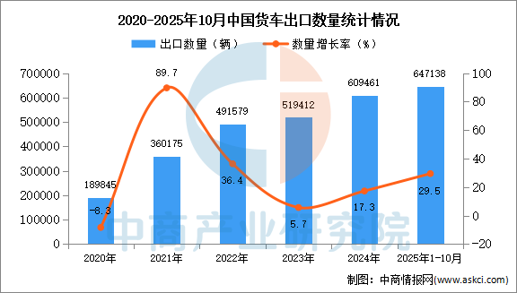 2025年10月中國(guó)貨車出口量及金額增長(zhǎng)情況