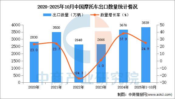 中商情報網(wǎng)訊:據(jù)中商產(chǎn)業(yè)研究院數(shù)據(jù)庫顯示,2024年中國摩托車出口量3676萬輛,同比增長37.9%。最新數(shù)據(jù)顯示,2025年1-10月中國摩托車出口量3839萬輛,同比增長24.9%。