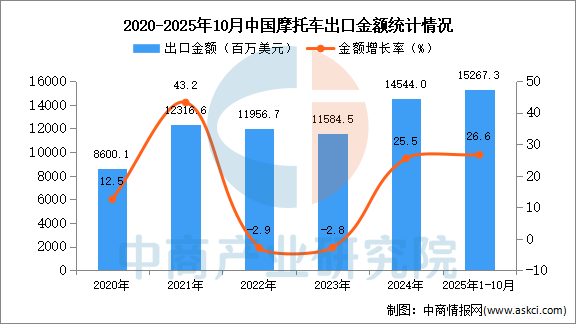 從金額方面來看,數(shù)據(jù)顯示,2025年1-10月中國摩托車出口金額15267.3百萬美元,同比增長26.6%。