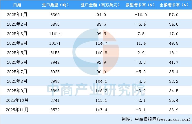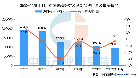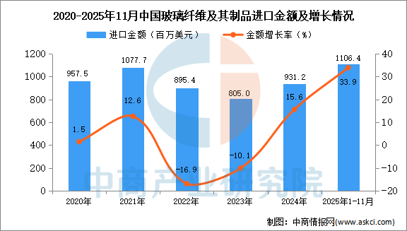 2025年11月中國(guó)玻璃纖維及其制品進(jìn)口量及金額增長(zhǎng)情況