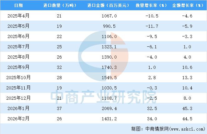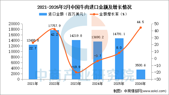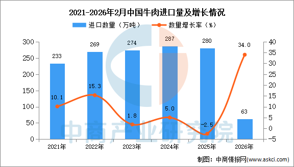 2026年2月中國牛肉進(jìn)口量及金額增長情況